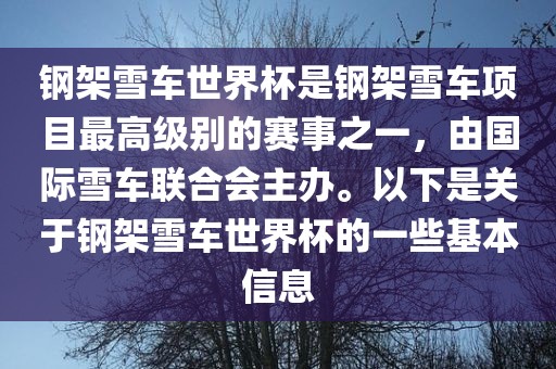 钢架雪车世界杯是钢架雪车项目最高级别的赛事之一,由国际雪车联合会主办。以下是关于钢架雪车世界杯的一些基本信息