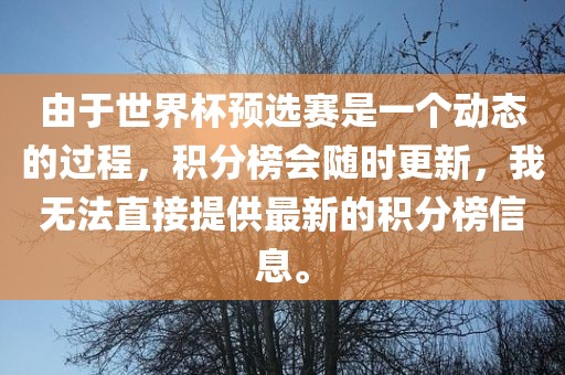 由于世界杯预选赛是一个动态的过程,积分榜会随时更新,我无法直接提供最新的积分榜信息。