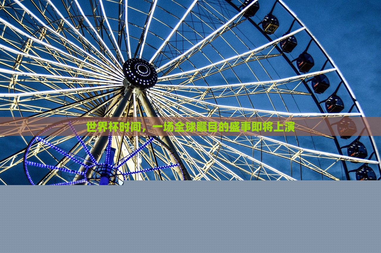 世界杯时间来临,全球瞩目的盛事即将上演,各国足球精英齐聚赛场,展开激烈的角逐。球迷们翘首以盼,期待着见证精彩对决和荣耀时刻的诞生。这是一场充满激情与荣耀的盛宴,也是展示各国足球实力和风采的舞台。让我们共同期待这场盛事的精彩上演!